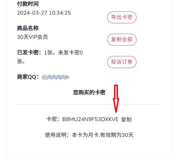 2.购买完成后等待几秒一般会自动跳转至卡密信息页面